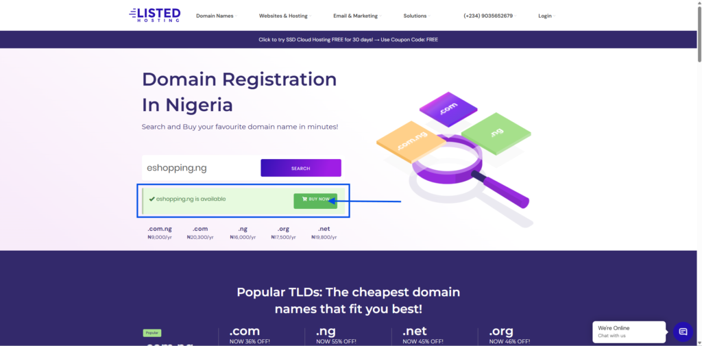 To register a new domain, enter your preferred domain name in the search area to check for its availability. If the domain name is available for purchase, click on Buy Now
