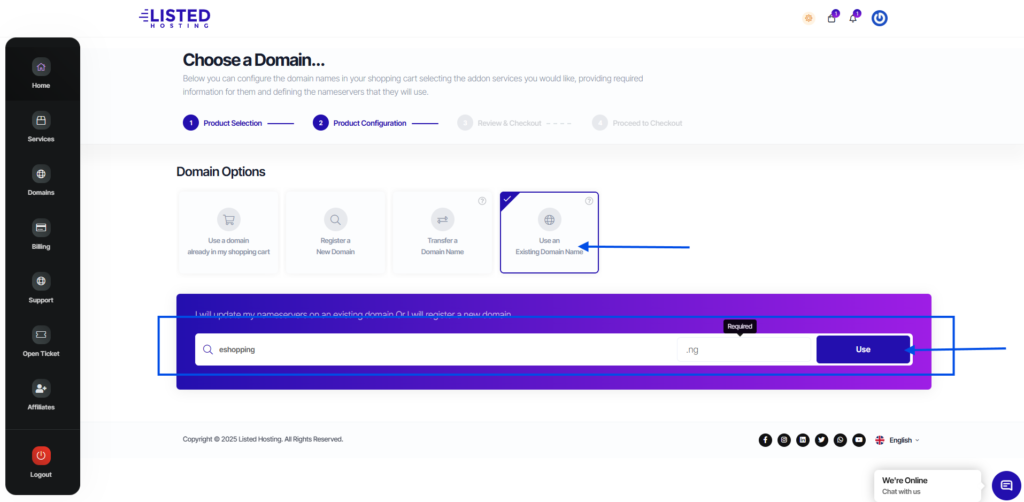 Proceed with the domain name in your shopping cart, it is selected by default. Or select “Use an Existing Domain Name” and enter the domain name in the provided area.