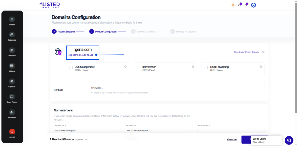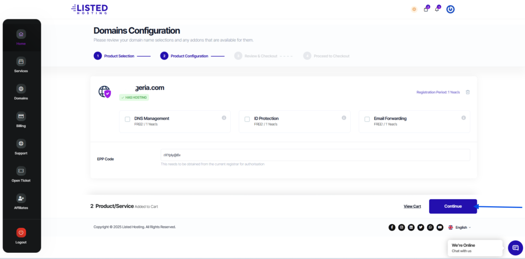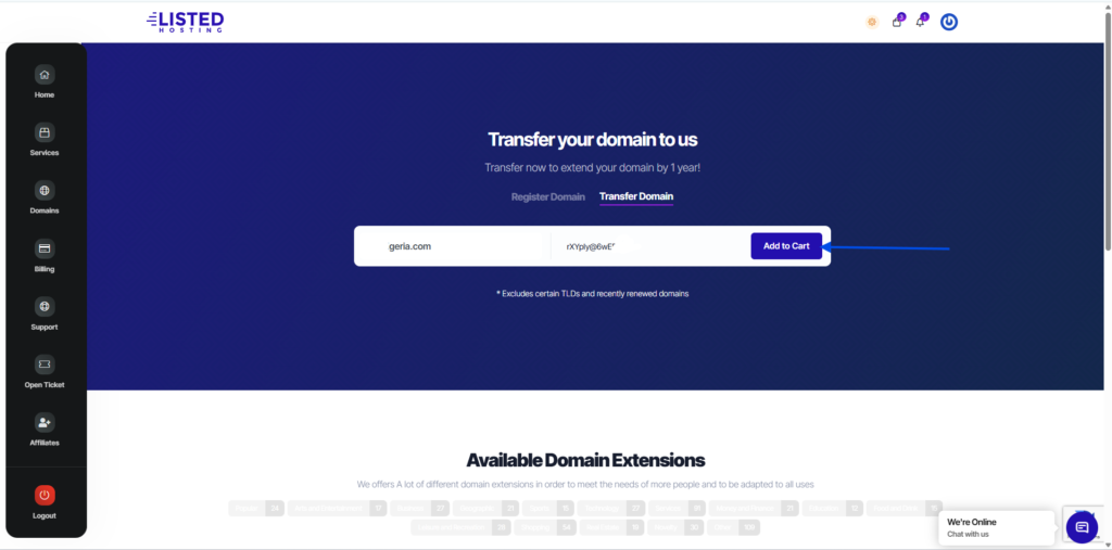 To transfer a domain to Listed Hosting, enter the domain name and provide your Auth/EPP code. Verify your credentials and click “Add to Cart”