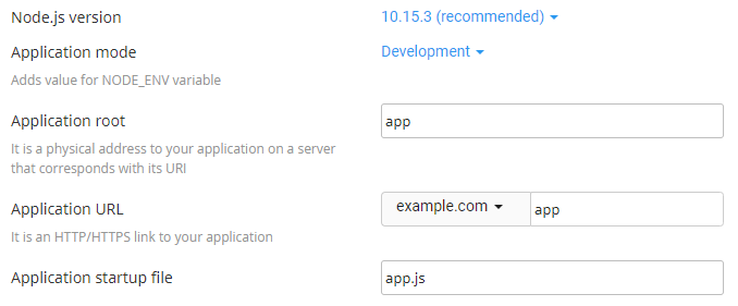 - Select your Application URL and startup file (if you do not name a startup file, app.js is used as the default)